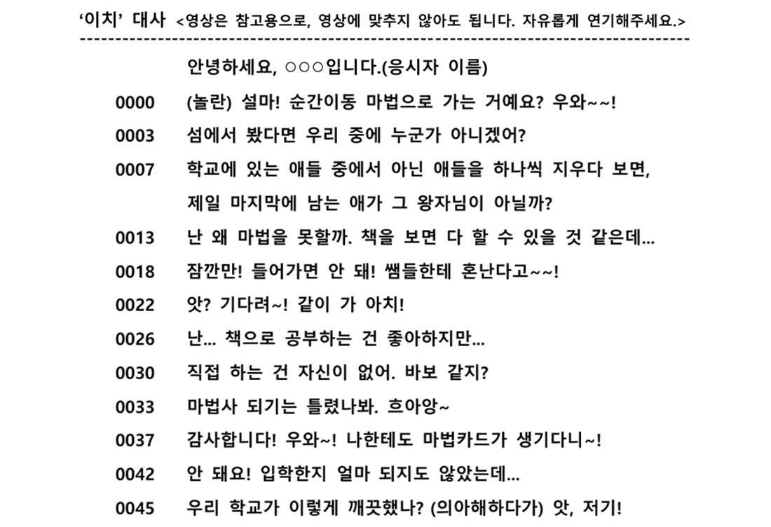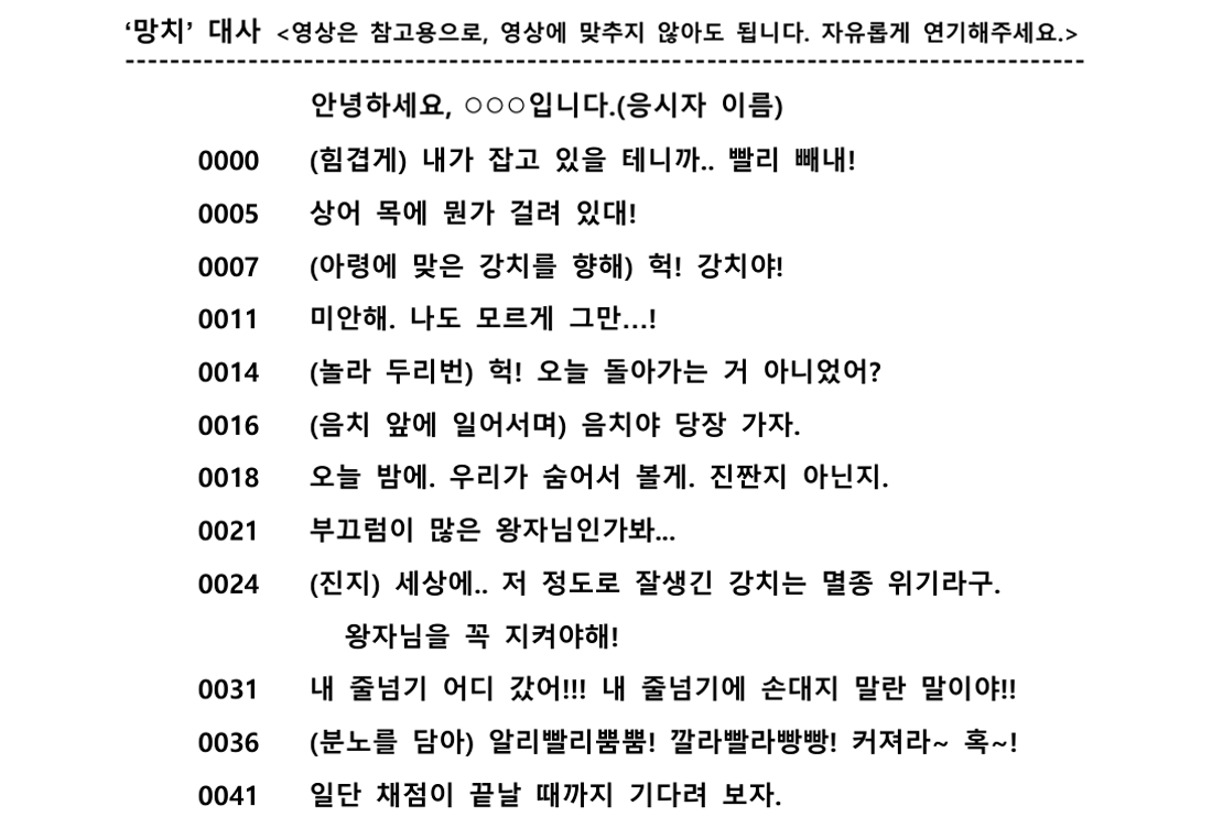 - 영상은 연기에 도움을 주기 위한 참고용이며, 영상에 맞추지 않아도 됩니다. 자유롭게 연기해 주세요.